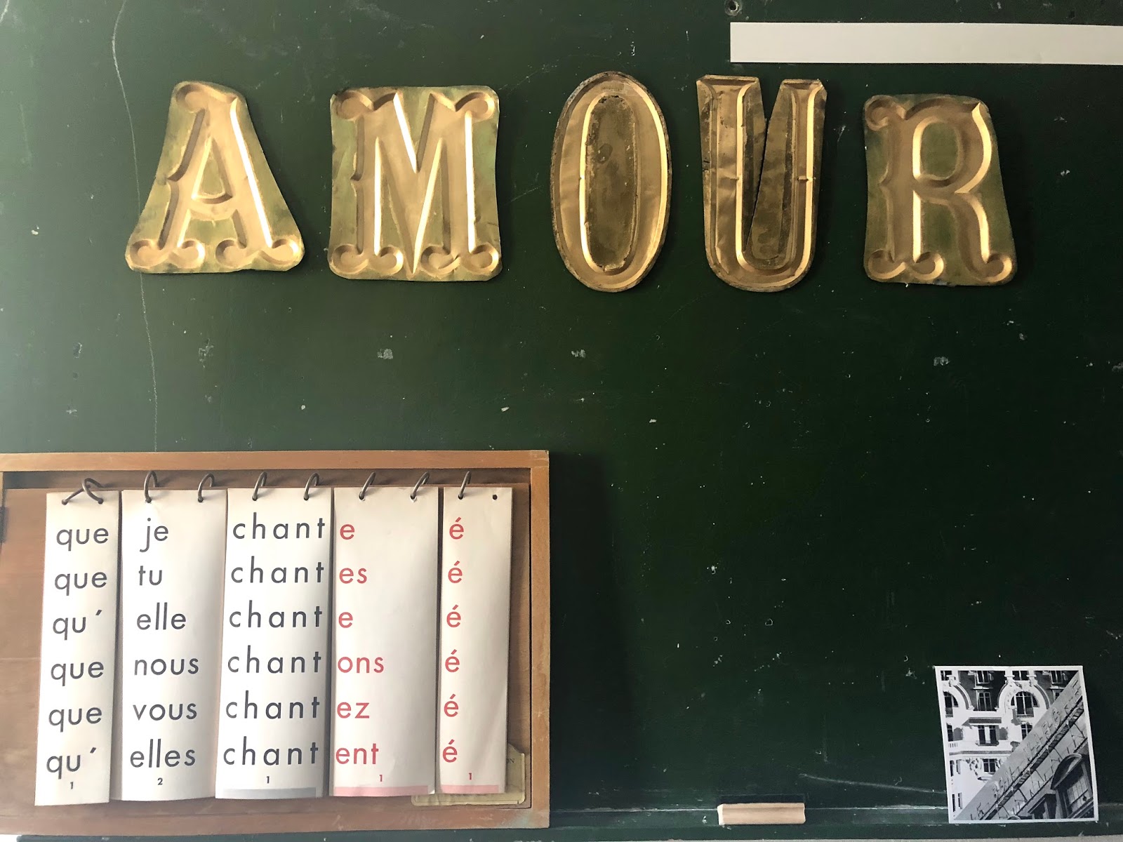 Dès l'entrée, le ton est donné. Le papier peint fleuri, le grand tableau d'écolier, les lettres d'enseigne A M O U R ... Bref, un retour en enfance avec des souvenirs de maison de famille et des odeurs de confiture dans la cuisine...